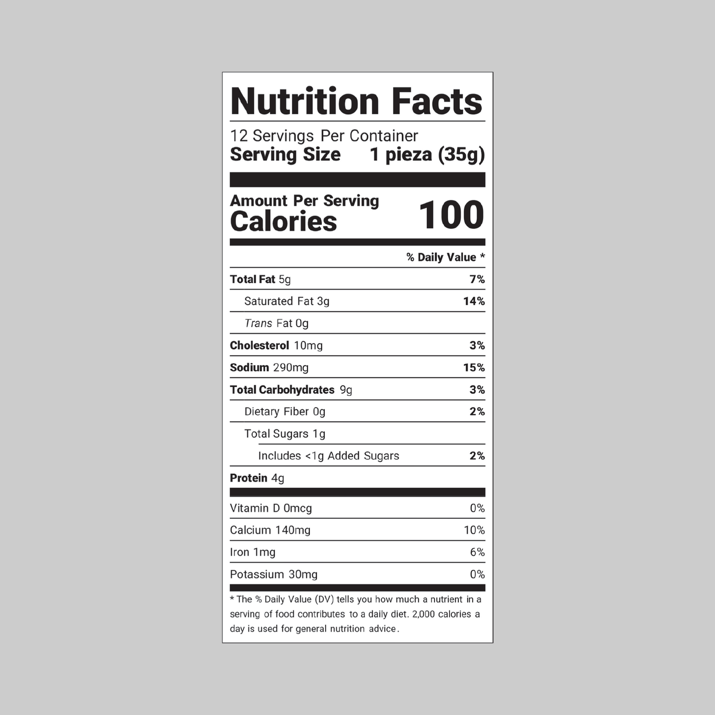 INGREDIENTS: WHITE SOFT CHEESE (PASTEURIZED MILK, SALT, CALCIUM, CHLORIDE AND ENZYMES), WHEAT FLOUR ENRICHED, WATER, SUGAR, CHIA SEEDS, FULLY REFINED. SOYBEAN OIL, LIQUIED EGGS WHITES, CORNSTARCH, SALT, BAKING POWDER (SODIUM ACID PYROSPHOSPHATE, SODIUM BI CARBONATE), POTASSIUM SORBATE.